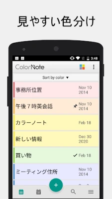 ColorNote カラーノートは、シンプルで使いやすいメモ帳アプリです。テキストノートやチェックリストで、アイデアやTODO、買い物リストを手軽に作成。色分け、ウィジェット、リマインダー機能であなたの生活をサポート。直感的な操作で素早くメモが取れます。