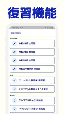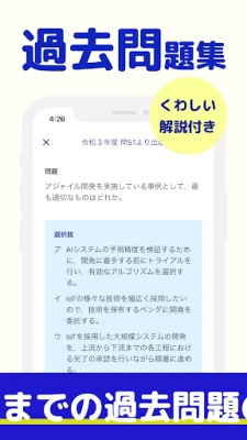 試験本番に向けた準備も万全です。豊富に収録された過去問題で実践力を養い、詳細な解説を通じて単なる解答だけでなく、背景にある概念まで深く掘り下げて理解を促進します。もし解答に迷ったり、苦手だと感じた問題があれば、復習チェック機能でマークしておきましょう。後から簡単に振り返ることができ、弱点克服への道を強力にアシストします。日々の学習時間も自動で記録されるため、努力が可視化され、学習意欲の向上にも繋がります。