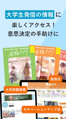 大学受験という人生の一大挑戦に挑む高校生の皆さんへ。情報戦を制し、志望校合格への確かな一歩を踏み出すための強力なパートナー、「合格サプリ」が登場しました。東京大学・早慶大をはじめとする難関大学の先輩たちが、自らの受験経験を基に厳選した生きた情報を、効率的に、そして無料であなたの元へお届けします。日々の学習に活力を与え、モチベーションを最大限に引き出すこのアプリは、あなたの意思決定を強力にサポートし、ライバルに差をつける「情報のアドバンテージ」を提供します。