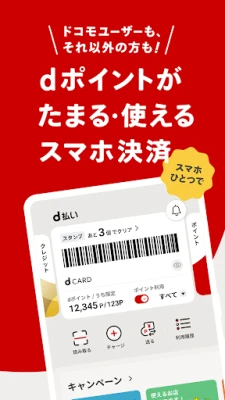 「d払い-スマホ決済アプリ、キャッシュレスでお支払い」は、スマホで簡単・便利なキャッシュレス決済を実現します。お支払いごとにdポイントがたまり、お得に利用可能。電話料金合算払いやd払い残高、クレジットカード登録ですぐに始められ、わずか30秒、4桁パスワード設定でバーコード一つのお支払いが完了します。