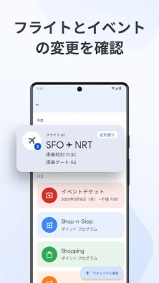 Google ウォレットの真価は、そのインテリジェントな機能性にあります。旅行のフライト前には搭乗券を、イベント当日にはチケットを、適切なタイミングで通知し、スムーズな移動をサポート。Google マップと連携した詳細な取引履歴の確認はもちろん、カレンダーやGoogle アシスタントとの同期により、フライトの遅延やゲート変更といった最新情報も自動で反映され、いつでも安心して行動できます。Gmailに保存された情報とも簡単に連携でき、初期設定も驚くほど手軽に完了します。