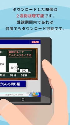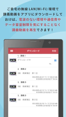 アプリ内に保存された講義コンテンツは、保存から2週間視聴可能です。受講期間内であれば何度でもアプリへの再取得ができますのでご安心ください。1講義(約2時間30分)あたり約600MBを目安に容量を要しますが、これによりオフラインでの安定した再生が実現します。コンテンツの取得にかかる時間は、ご利用の端末性能や回線速度に左右されますことをご承知おきください。本アプリはAndroid 6.0以降のスマートフォンでご利用いただけますが、全ての機種での動作を保証するものではありません。特に、Amazon社 FireOSやOPPO社 ColorOSのようなAndroidベースの独自OSは動作保証外となります。